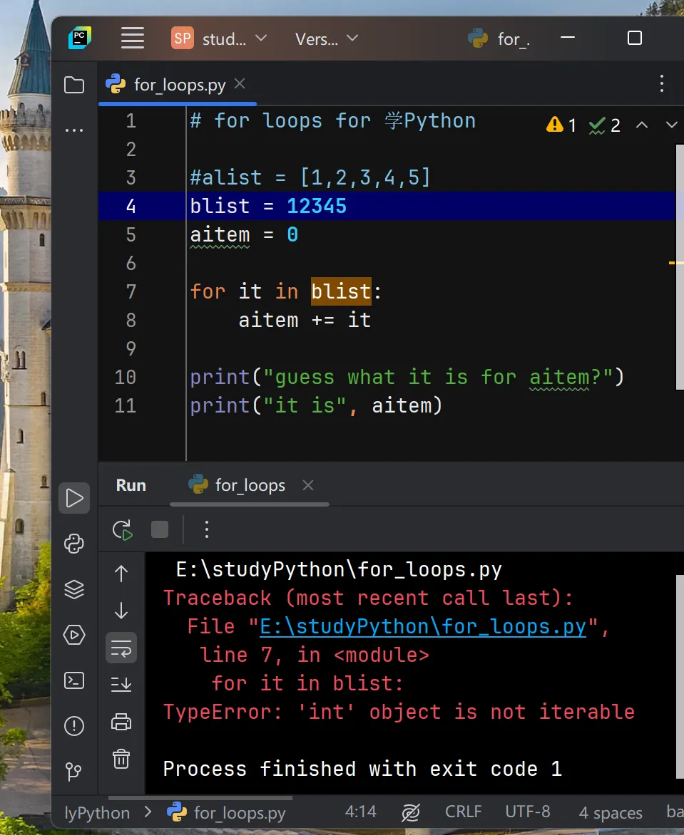 如果硬要运行这段代码,将看到红色的报错信息,程序异常退出。(exit with code 1)