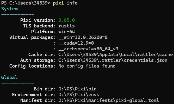 env:PIXIVERSION=′v0.65.0′;env:PIXI_HOME='D:\PS\Pixi'; env:PIXINOPATHUPDATE=′D:\PS\Pixi′;env:PIXI_DOWNLOAD_URL='你的真实下载地址'; irm -useb https://pixi.sh/install.ps1 | iex我们可以在PowerShell命令窗口中输入pixi info检查是否安装成功,出现以下类似信息则安装成功: