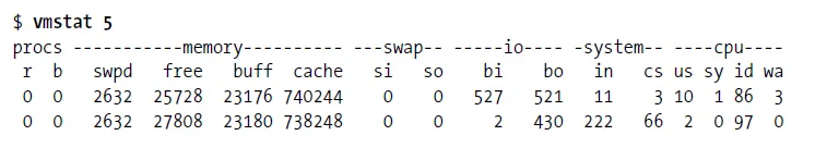 vmstat(VirtualMeomoryStatistics,虚拟内存统计)是 Linux 中监控内存的常用工具,可对操作系统的虚拟内存、进程、CPU 等的整体情况进行监视。vmstat 的常规用法:vmstat interval times 即每隔 interval 秒采样一次,共采样 times 次,如果省略 times,则一直采集数据,直到用户手动停止为止。简单举个例子: