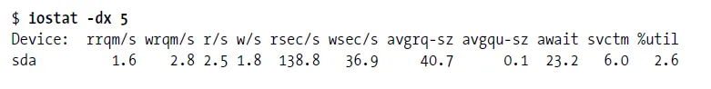 常见 linux 的磁盘 IO 指标的缩写习惯:rq 是 request,r 是 read,w 是 write,qu 是 queue,sz 是 size,a 是verage,tm 是 time,svc 是 service。