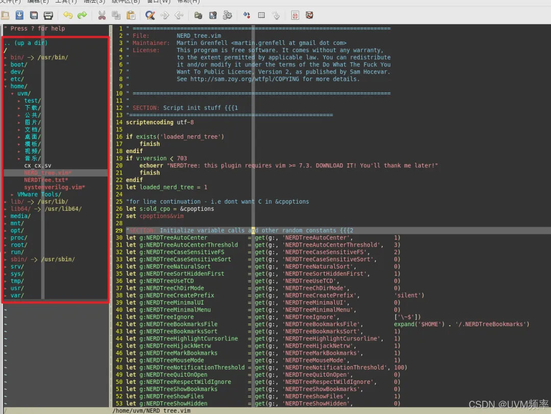 在vim74目录下解压目录树插件设置后输入:NERDTree即可打开目录树,打开后的效果如下: