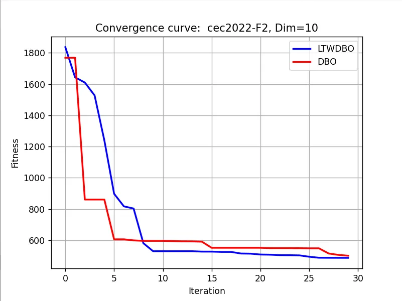 import numpy as npfrom matplotlib import pyplot as plt# In[]:import opfunu # 参考:https://github.com/thieu1995/opfunuimport copy # 导入copy模块,用于对象的复制。import math'''适应度函数及维度dim的选择cec函数名字格式:函数名+年份,比如要选择2022的F1函数,func_num = 'F1'+'2022'cec2005:F1-F25, 可选 dim = 10, 30, 50cec2008:F1-F7, 可选 2 <= dim <= 1000cec2010:F1-F20, 可选 100 <= dim <= 1000cec2013:F1-F28, 可选 dim = 2, 5, 10, 20, 30, 40, 50, 60, 70, 80, 90, 100cec2014:F1-F30, 可选 dim = 10, 20, 30, 50, 100cec2015:F1-F15, 可选 dim = 10, 30cec2017:F1-F29, 可选 dim = 2, 10, 20, 30, 50, 100cec2019:F1-F10, 可选 dim: F1=9,F2=16,F3=18,其他=10cec2020:F1-F10, 可选 dim = 2, 5, 10, 15, 20, 30, 50, 100cec2021:F1-F10, 可选 dim = 2, 10, 20cec2022:F1-F12, 可选 dim = 2, 10, 20''''''边界检查函数'''def boundary(pop, lb, ub):# 定义一个边界检查函数,确保种群中的个体不超出预定义的边界。 pop = pop.flatten() lb = lb.flatten() ub = ub.flatten()# 将输入参数扁平化,以便进行元素级操作。# 防止跳出范围,除学习率之外 其他的都是整数 pop = [int(pop[i]) if i > 0 else pop[i] for i in range(lb.shape[0])]# 将除了学习率以外的参数转换为整数。for i in range(len(lb)):if pop[i] > ub[i] or pop[i] < lb[i]:# 检查个体是否超出边界。if i == 0: pop[i] = (ub[i] - lb[i]) * np.random.rand() + lb[i]# 如果是学习率,则在边界内随机选择一个值。else: pop[i] = np.random.randint(lb[i], ub[i])# 对于整数参数,随机选择一个边界内的整数值。return pop# 返回修正后的个体。''' 种群初始化函数 '''def initial(pop, dim, ub, lb):# 定义一个初始化种群的函数。 X = np.zeros([pop, dim])# 创建一个形状为[种群大小, 维度]的零矩阵。for i in range(pop):for j in range(dim): X[i, j] = np.random.rand() * (ub[j] - lb[j]) + lb[j]# 在边界内随机初始化每个个体的每个参数。return X, lb, ub# 返回初始化后的种群及边界。'''计算适应度函数'''def CaculateFitness(X):# 定义一个计算适应度的函数。 pop = X.shape[0]# 获取种群的大小。 fitness = np.zeros([pop, 1])# 创建一个形状为[种群大小, 1]的零矩阵来存储适应度。for i in range(pop): fitness[i] = cec_fun(X[i, :])# 对每个个体调用适应度函数进行计算。return fitness# 返回计算得到的适应度。'''适应度排序'''def SortFitness(Fit):# 定义一个对适应度进行排序的函数。 fitness = np.sort(Fit, axis=0)# 按适应度大小进行排序。 index = np.argsort(Fit, axis=0)# 获取排序后的索引。return fitness, index# 返回排序后的适应度和索引。'''根据适应度对位置进行排序'''def SortPosition(X, index):# 定义一个根据适应度排序位置的函数。 Xnew = np.zeros(X.shape)# 创建一个与X形状相同的零矩阵。for i in range(X.shape[0]): Xnew[i, :] = X[index[i], :]# 根据适应度的排序结果重新排列位置。return Xnew# 返回排序后的位置也可直接购买改进蜣螂算法全家桶