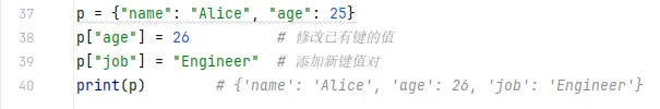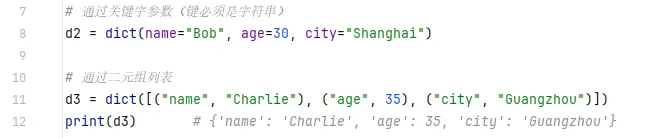 - 在 Python 3.7+ 中,字典会保持插入顺序(即按照你添加键值对的顺序存储)。