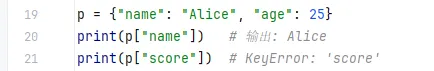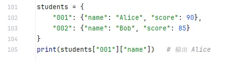 {} 表示,里面的元素是成对出现的键: 值。 - 键(key)必须是不可变类型,例如字符串、数字、元组;值(value)可以是任意类型(包括列表、字典等)。