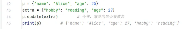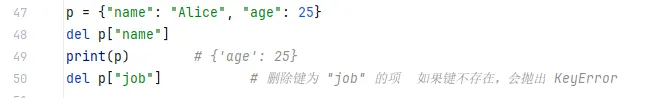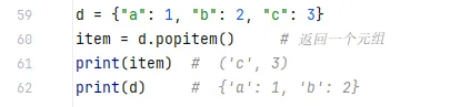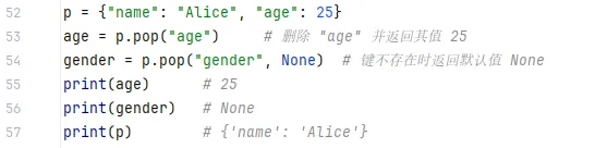 pop(key[, default]) —— 删除并返回对应的值popitem() —— 删除并返回最后插入的一个键值对(Python 3.7+ 有序)popitem() 是 Python 字典的一个方法,用于随机删除并返回一个键值对。但在 Python 3.7 及之后版本中,字典会保持插入顺序,因此它实际的行为是删除并返回最后插入的那个键值对(后进先出,LIFO)