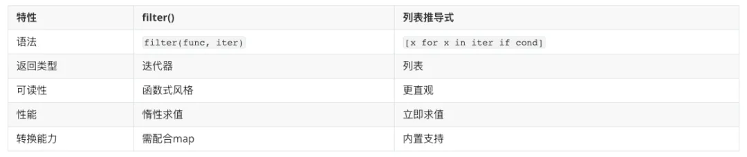 numbers = [1, 2, 3, 4, 5, 6, 7, 8, 9, 10]# filter方式result1 = list(filter(lambda x: x % 2 == 0, numbers))# 列表推导式result2 = [x for x in numbers if x % 2 == 0]print(result1) # [2, 4, 6, 8, 10]print(result2) # [2, 4, 6, 8, 10]