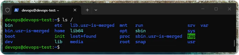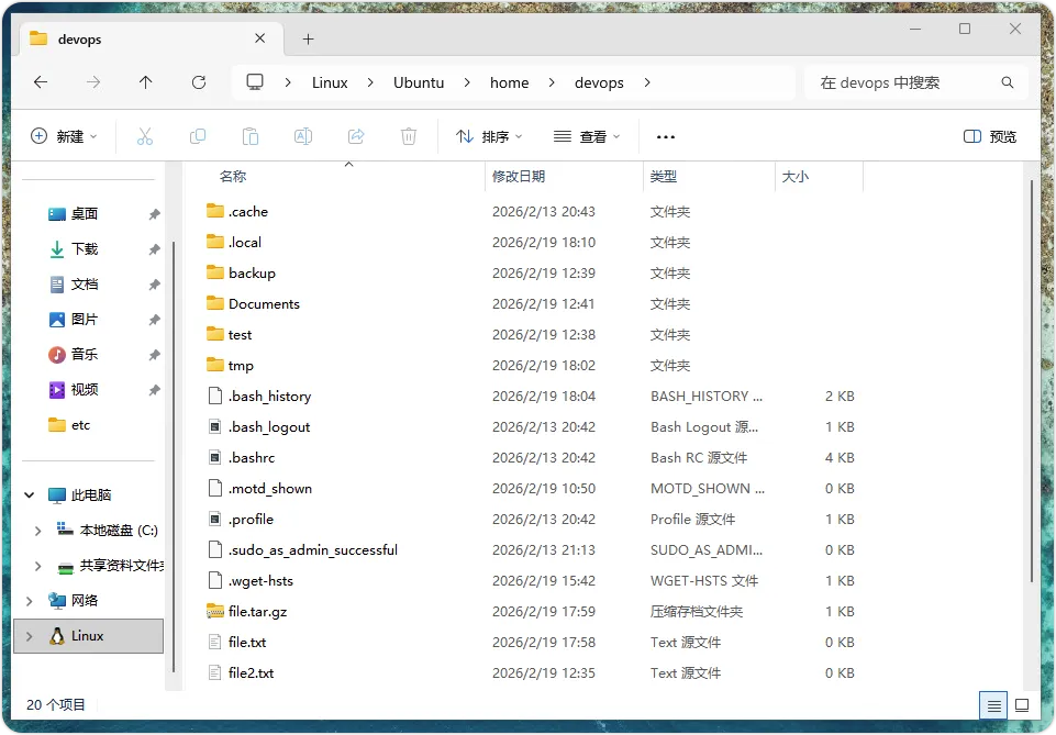 我们可以在终端机使用 ls / 命令,在终端机查看根目录结构,如下所示:或使用 Windows 文件资源管理器来查看 devops 用户目录,如下所示:请在上方选【Ubuntu】,可以切换至 Linux 文件系统的根目录,如下图所示:根目录「/」下的子目录说明