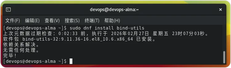 我们无需添加任何第三方仓库即可在 Linux 系统上获取这个 Bind 工具。所有必需的软件包都可以通过系统的标准仓库获得。不过,它可能已经安装在您的系统上了。sudo dnf install bind-utils