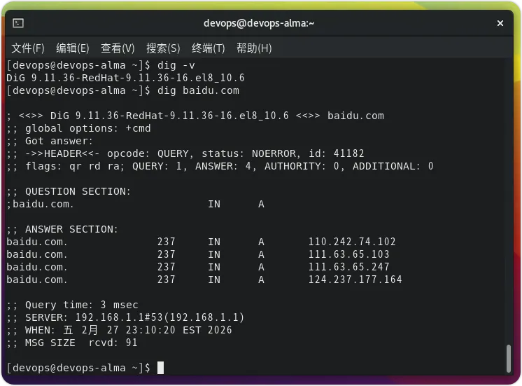 Dig(域名信息探测器)是一个程序/命令,可用于从 DNS 服务器查询信息。DNS 代表域名服务,用于将 IP 地址转换为域名,反之亦然。它基于一个全球分布式的数据库。Dig 是针对 DNS 服务器(如 Berkeley Internet Name Domain Server,即 Bind)的客户端程序,支持 IPv4 和 IPv6。Dig 主要用于分析和检查 DNS 服务器。如何在 AlmaLinux 8 上安装 Dig 命令