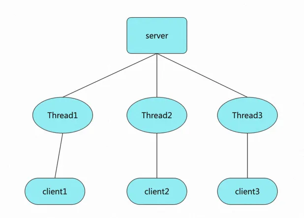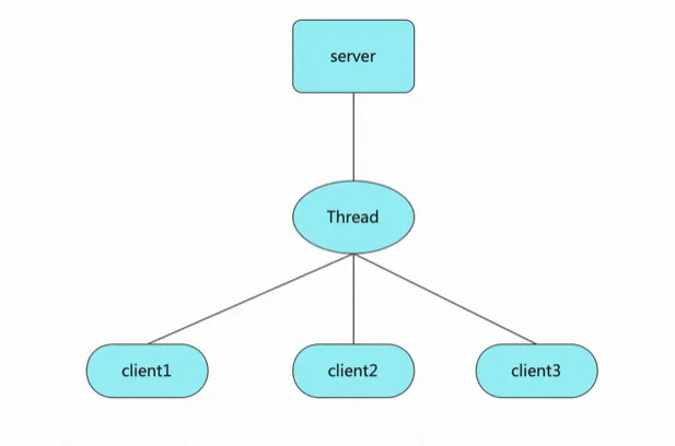 请目光聚焦第7行,这里会产生阻塞,接收到一个客户端连接后才能继续运行。再聚焦第16行,reader.readLine会产生阻塞,如果是单线程,则线程挂起,那么只能处理极少数连接。所以为了让程序能支持多个客户端,不得不使用多线程,最终得到模型如下: