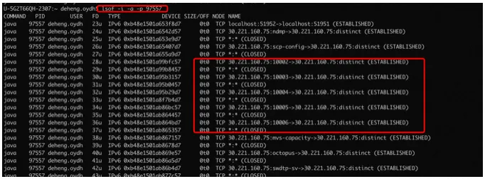 too many open files,这里说明打开的文件描述符过多,什么是文件描述符?文件描述符( file descriptor简称fd,请记住这个概念,后续会多次出现)在linux中,一切皆文件。实际上,它是一个索引值,指向一个文件记录表,该表记录内核为每一个进程维护的文件记录信息。由于本例中创建了三万个socket,而一个socket(即一个tcp连接)就对应一个文件描述符(fd),30000已经超过了系统默认的文件描述符限制。那怎么去查看fd信息呢?可通过lsof -i -a -p [pid]查看当前进程打开的tcp相关的文件描述符,如下图,红框标注的就是socket对应的fd: