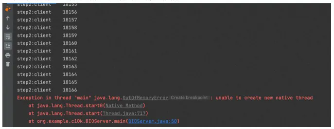unable to create new native thread 不能再创建新的本地线程。当然,系统线程数限制是可以调节的。但是存在的问题也很明显,具体有哪些问题呢?从上面的分析,结合BIO处理c10k的过程,不难得出以下问题: