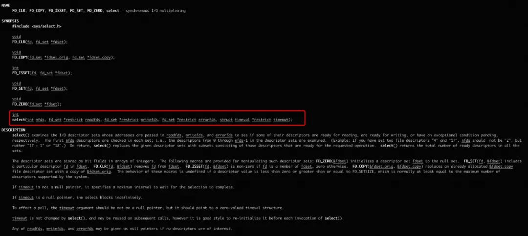 int select(int nfds, //要监视的文件描述符数量 fd_set *restrict readfds, //可读文件描述符集合 fd_set *restrict writefds, //可写文件描述符集合 fd_set *restrict errorfds, //异常文件描述符集合 struct timeval *restrict timeout//超时时间 );