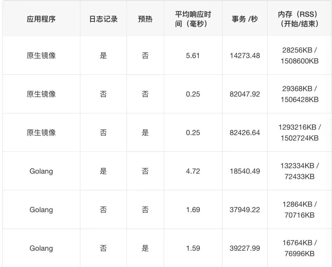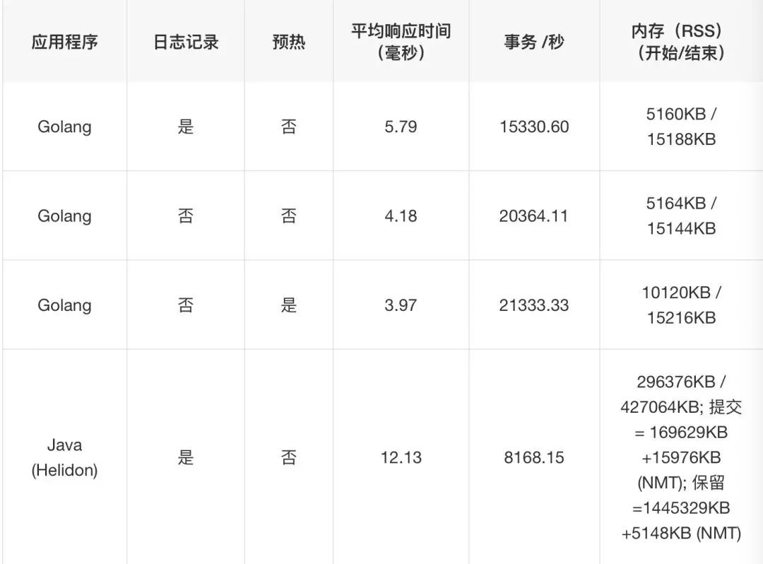 本轮最佳性能来自 GraalVM 原生镜像,其平均响应时间为 0.25 毫秒,每秒可执行 82426 项事务;Go 的最佳结果为 1.59 毫秒外加每秒 39227 项事务,而其内存占用量比前者高出两个数量级!