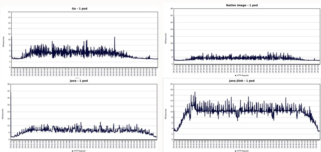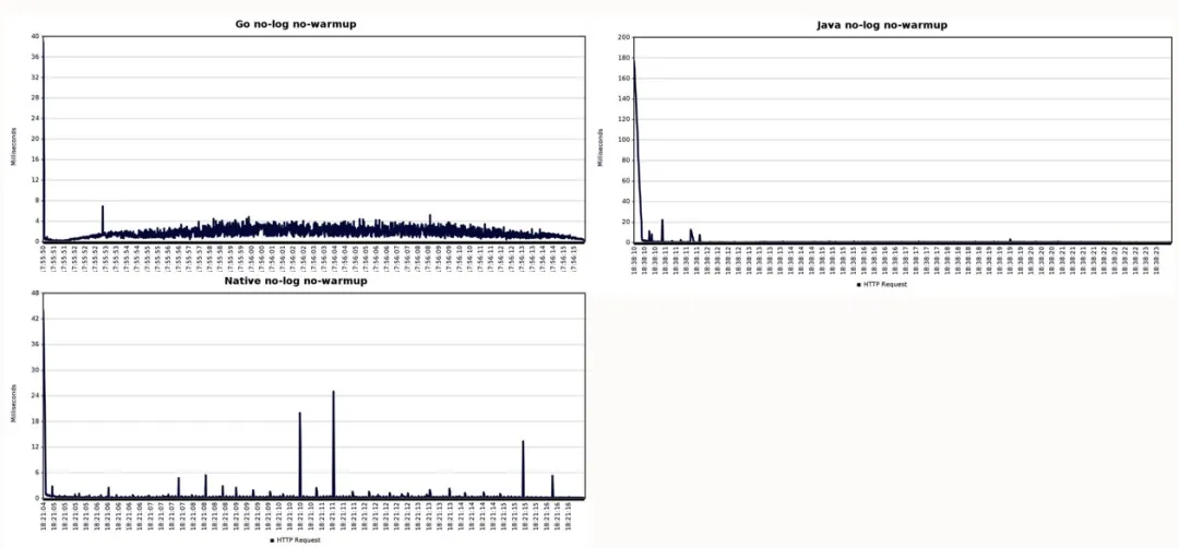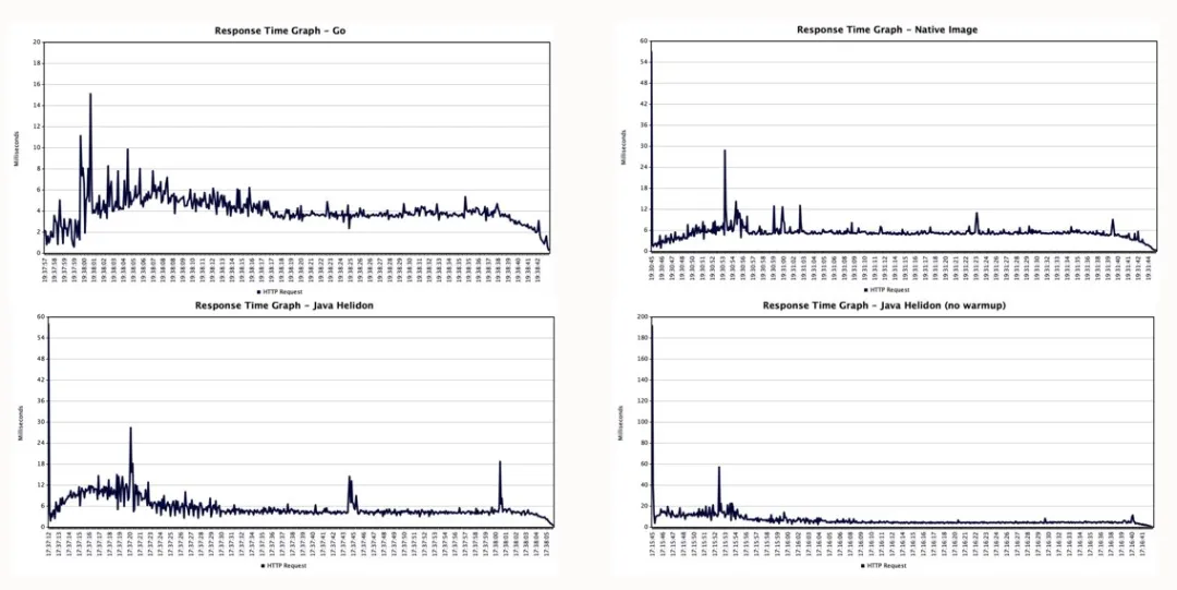 请注意,在所有三种 Java 变体当中,第一批请求的响应时间要长得多(蓝线相较于左轴的高度)而且在各项测试中,我们还看到一些峰值,其可能是由垃圾收集或优化所引起。