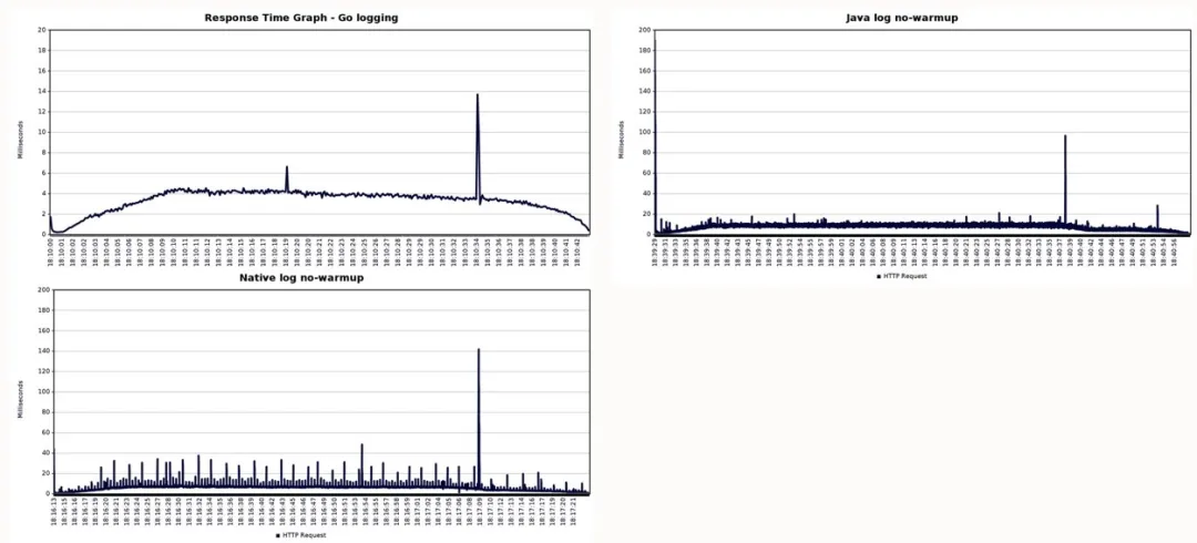 日志记录似乎是影响性能的主要问题,特别是 java.util.logging。因此,我们在启用与禁用日志记录两种条件下进行了测试。我们还注意到,Go 应用程序性能主要受到日志记录的影响。