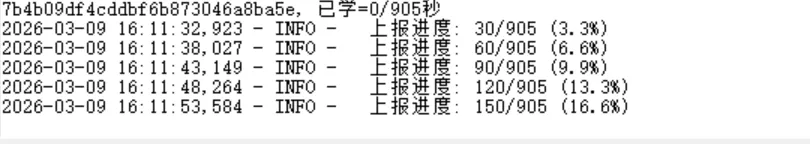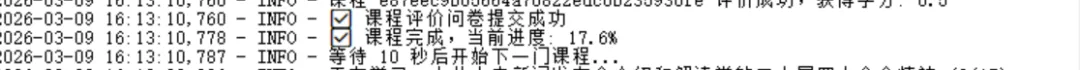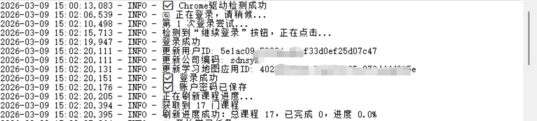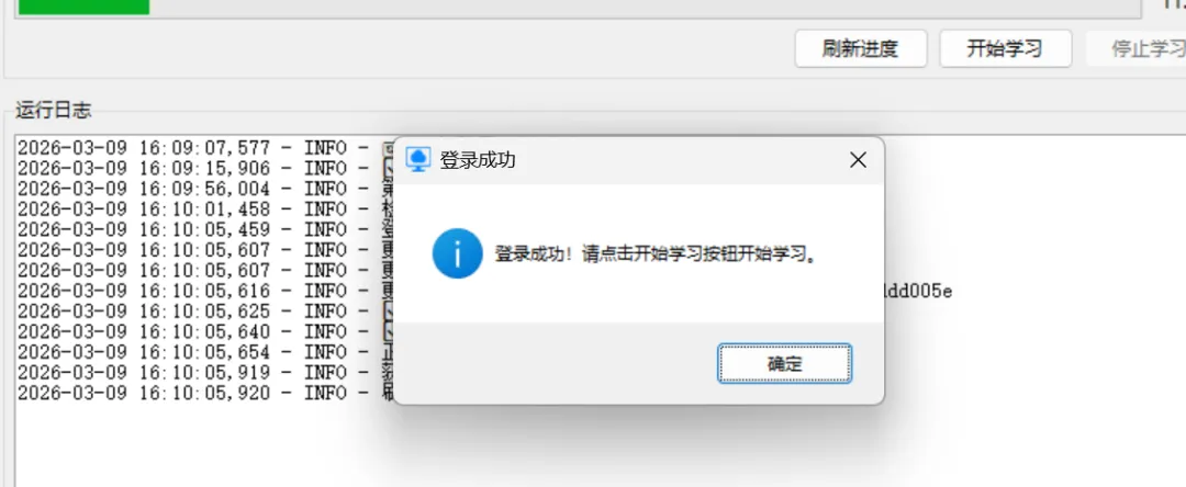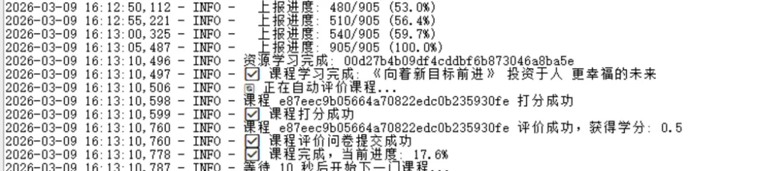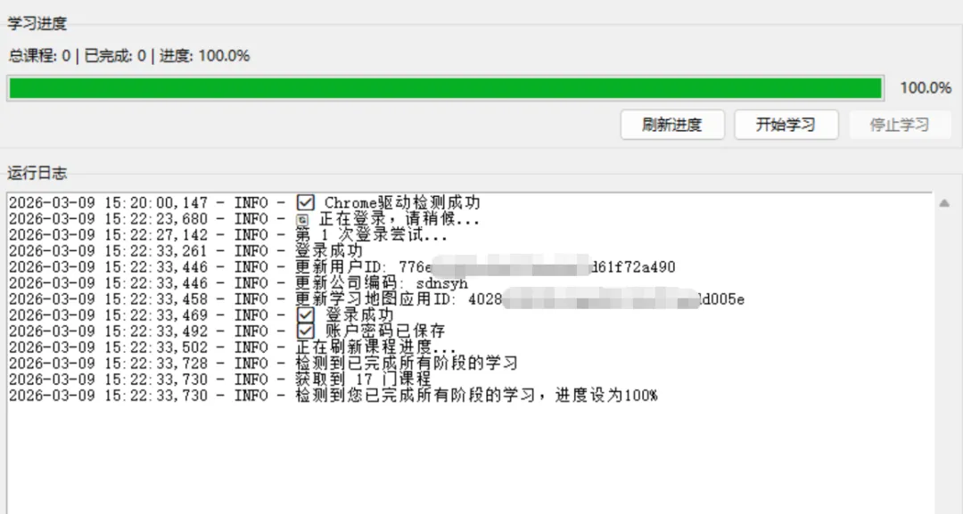 登录后自动刷新进度,显示总课程数、已完成数及百分比。点击“刷新进度”可手动更新。最重要的是,当服务器返回“您已完成所有阶段的学习”时,进度直接跳到100%,并停止学习。