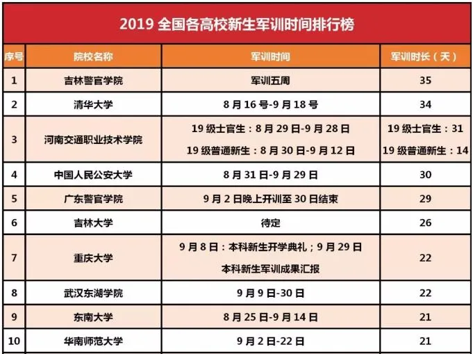 每所高校对军训的要求不同,从时间来看,短的只有5天,长的多达一个月,根据网上一份军训时间排行榜,比如清华大学,以34天稳居第二。(警校排第一也是无可厚非了,不过吉林的院校确实热衷军训,前十中两所吉林的院校上榜)