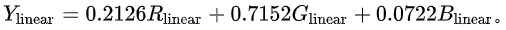 人类视觉对绿色最敏感,因此它具有最大的系数值(0.7152),对蓝色最不敏感,因此具有最小的系数(0.0722)。