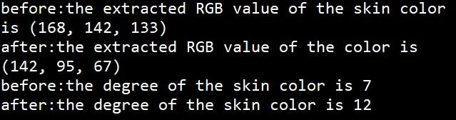if __name__ == '__main__': img_before= 'images/before1.jpg' img_after='images/after.jpg' color_before=skin_color(img_before) color_after=skin_color(img_after) print("before:the extracted RGB value of the skin color is {0}".format(color_before)) print("after:the extracted RGB value of the color is {0}".format(color_after)) list=[(200, 172, 153), (200, 169, 149), (197, 166, 145), (194, 163, 142), (190, 157, 134), (187, 152, 129), (182, 146, 121), (177, 136, 108), (168, 127, 100), (160, 118, 90), (148, 108, 81), (135, 98, 73), (119, 87, 65)] #color_dir="skin_color" #skincolor.load_color(color_dir,list) #print(list) #print(list) degree_before=Compare(list,color_before) degree_after=Compare(list,color_after) print("before:the degree of the skin color is {0}".format(degree_before)) print("after:the degree of the skin color is {0}".format(degree_after))