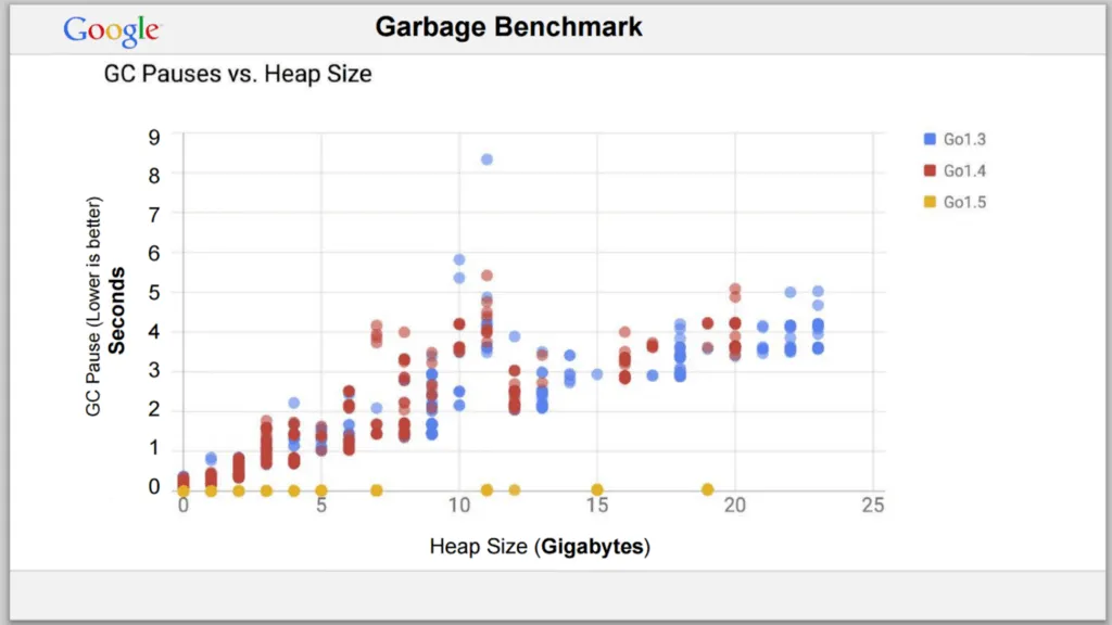 Go 的 GC 并未使用“弱世代假设”,但它的表现仍然非常出色,并且 STW(Stop-the-World)的时间非常短。在 1.5 版中,STW 降得更多,并且很稳定,而在 1.8 版中,它降到了 1 毫秒以下。