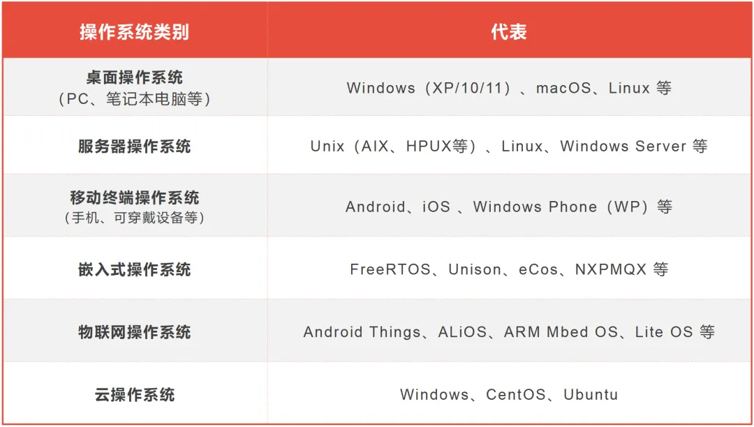 从使用场景来看,操作系统大致可以分为桌面操作系统、服务器操作系统、移动终端操作系统、嵌入式操作系统、物联网操作系统、云操作系统等类别。