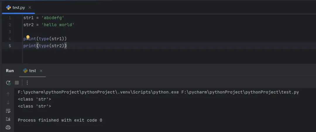 str1 = 'abcdefg'str2 = 'hello world'print(type(str1))print(type(str2))
