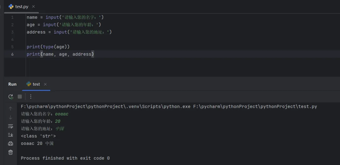name = input('请输入您的名字:')age = input('请输入您的年龄:')address = input('请输入您的地址:')print(type(age))print(name, age, address)