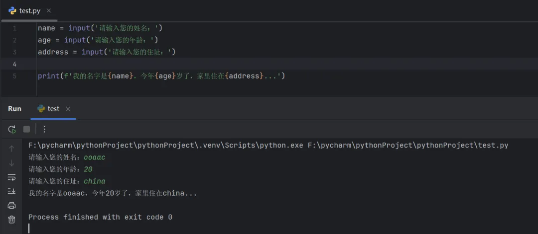 name = input('请输入您的姓名:')age = input('请输入您的年龄:')address = input('请输入您的住址:')print(f'我的名字是{name},今年{age}岁了,家里住在{address}...')