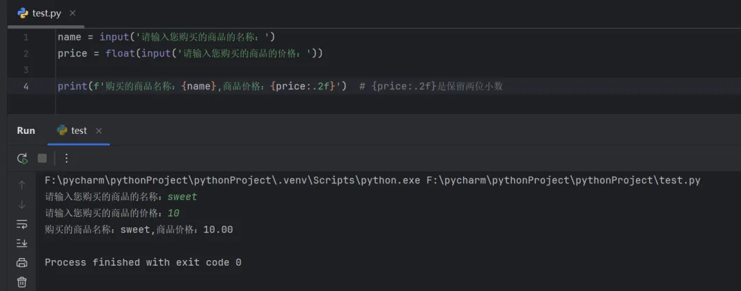 name = input('请输入您购买的商品的名称:')price = float(input('请输入您购买的商品的价格:'))price(f'购买的商品名称:{name},商品价格:{price:.2f}') # {price:.2f}是保留两位小数