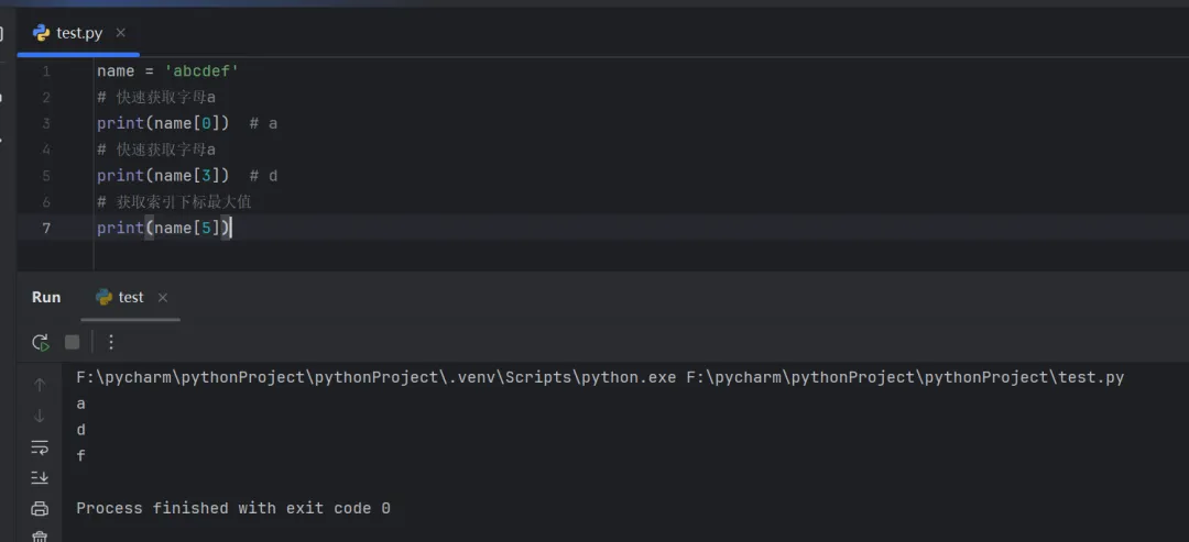 name = 'abcdef'# 快速获取字母aprint(name[0]) # a# 快速获取字母aprint(name[3]) # d# 获取索引下标最大值print(name[5])