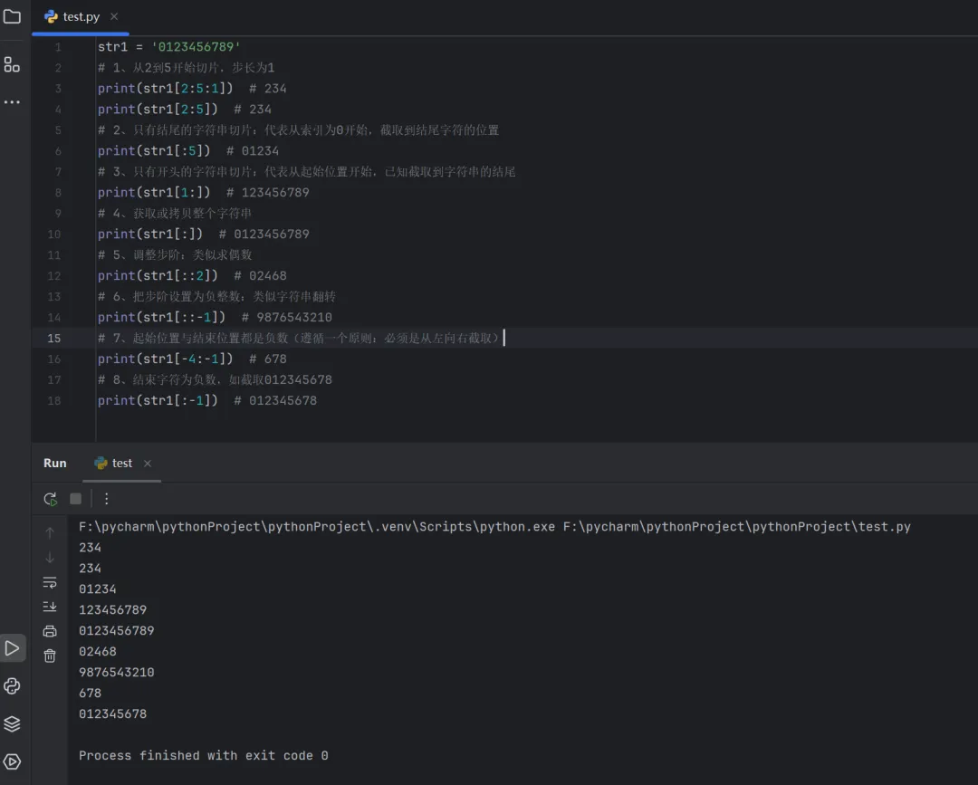 str1 = '0123456789'# 1、从2到5开始切片,步长为1print(str1[2:5:1]) # 234print(str1[2:5]) # 234# 2、只有结尾的字符串切片:代表从索引为0开始,截取到结尾字符的位置print(str1[:5]) # 01234# 3、只有开头的字符串切片:代表从起始位置开始,已知截取到字符串的结尾print(str1[1:]) # 123456789# 4、获取或拷贝整个字符串print(str1[:]) # 0123456789# 5、调整步阶:类似求偶数print(str1[::2]) # 02468# 6、把步阶设置为负整数:类似字符串翻转print(str1[::-1]) # 9876543210# 7、起始位置与结束位置都是负数(遵循一个原则:必须是从左向右截取)print(str1[-4:-1]) # 678# 8、结束字符为负数,如截取012345678print(str1[:-1]) # 012345678