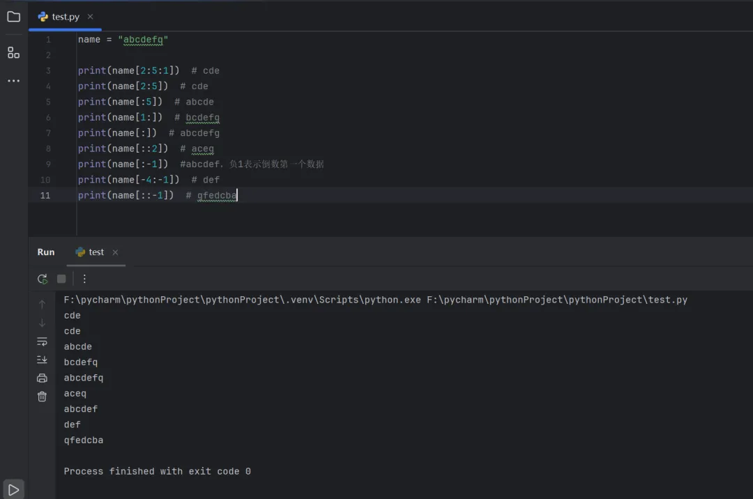 name = "abcdefq"print(name[2:5:1]) # cdeprint(name[2:5]) # cdeprint(name[:5]) # abcdeprint(name[1:]) # bcdefgprint(name[:]) # abcdefgprint(name[::2]) # acegprint(name[:-1]) #abcdef,负1表示倒数第一个数据print(name[-4:-1]) # defprint(name[::-1]) # gfedcba