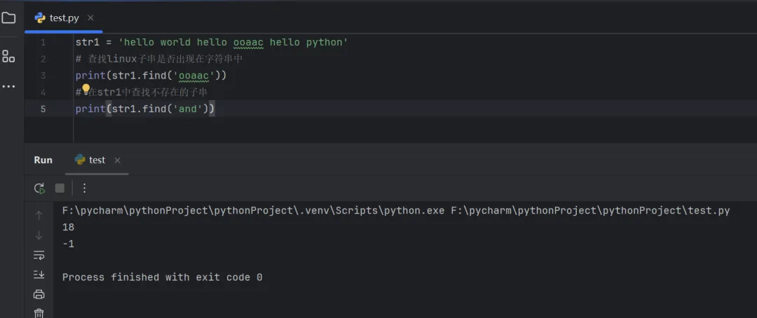 str1 = 'hello world hello ooaac hello python'# 查找linux子串是否出现在字符串中print(str1.find('ooaac'))# 在str1中查找不存在的子串print(str1.find('and'))