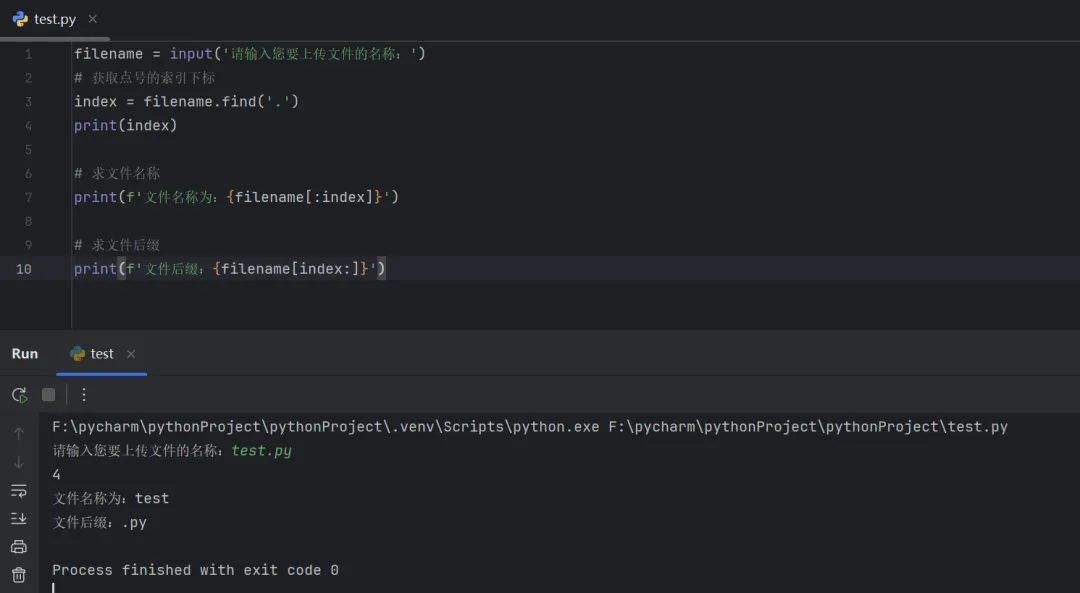 filename = input('请输入您要上传文件的名称:')# 获取点号的索引下标index = filename.find('.')print(index)# 求文件名称print(f'文件名称为:{filename[:index]}')# 求文件后缀print(f'文件后缀:{filename[index:]}')