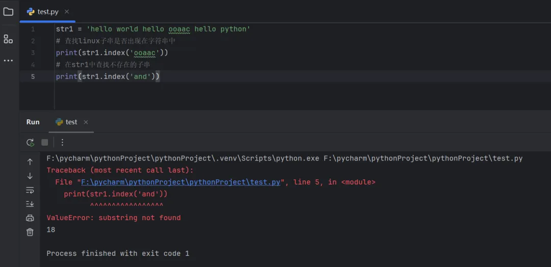 str1 = 'hello world hello ooaac hello python'# 查找linux子串是否出现在字符串中print(str1.index('ooaac'))# 在str1中查找不存在的子串print(str1.index('and'))