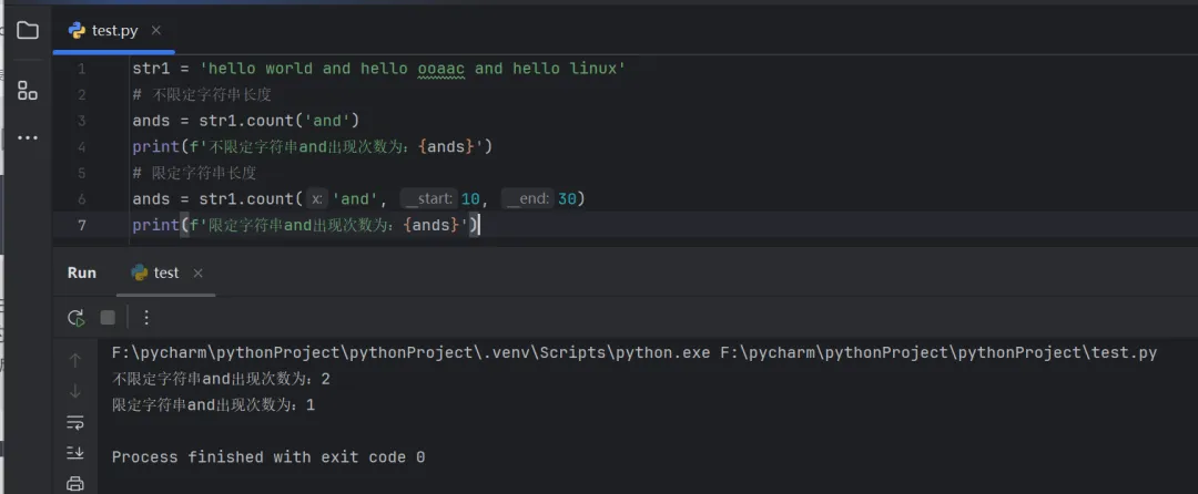 str1 = 'hello world and hello ooaac and hello linux'# 不限定字符串长度ands = str1.count('and')print(f'不限定字符串and出现次数为:{ands}')# 限定字符串长度ands = str1.count('and', 10, 30)print(f'限定字符串and出现次数为:{ands}')