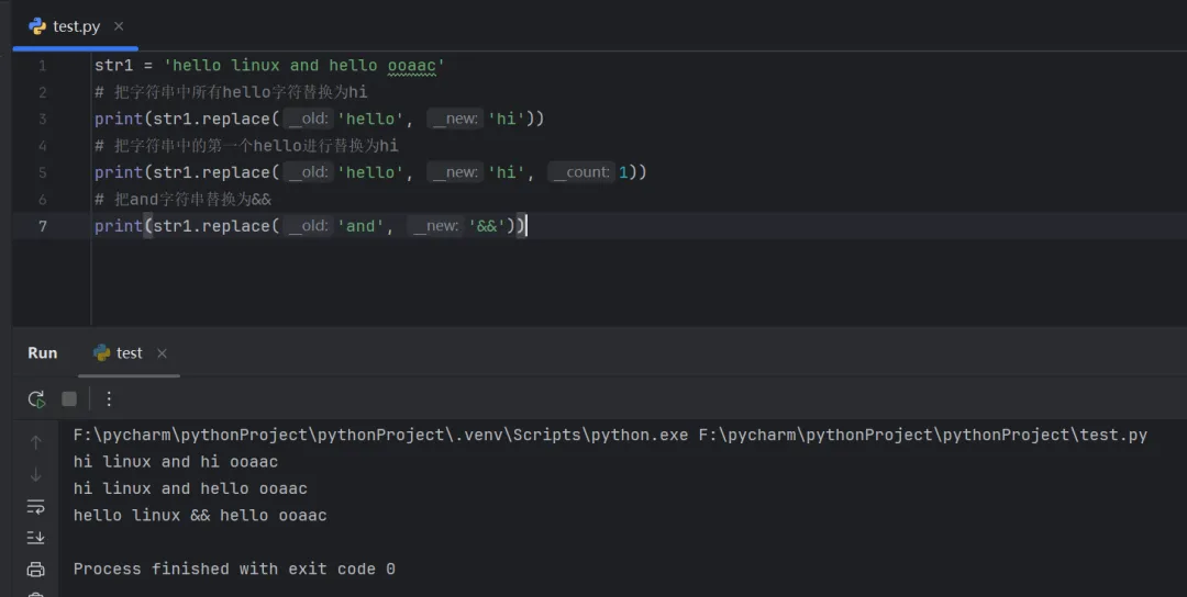 str1 = 'hello linux and hello ooaac'# 把字符串中所有hello字符替换为hiprint(str1.replace('hello', 'hi'))# 把字符串中的第一个hello进行替换为hiprint(str1.replace('hello', 'hi', 1))# 把and字符串替换为&&print(str1.replace('and', '&&'))