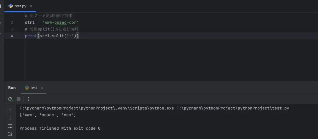 # 定义一个要切割的字符串str1 = 'www-ooaac-com'# 使用split()方法进行切割print(str1.split('-'))