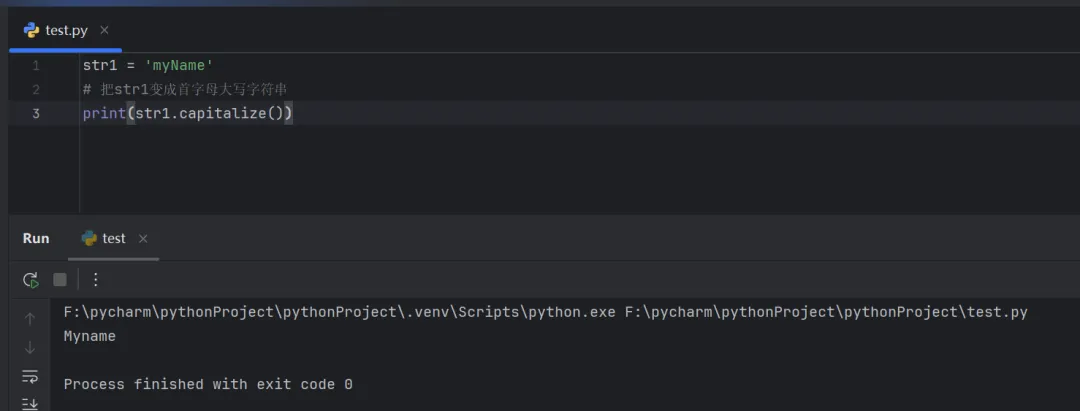 str1 = 'myName'# 把str1变成首字母大写字符串print(str1.capitalize())