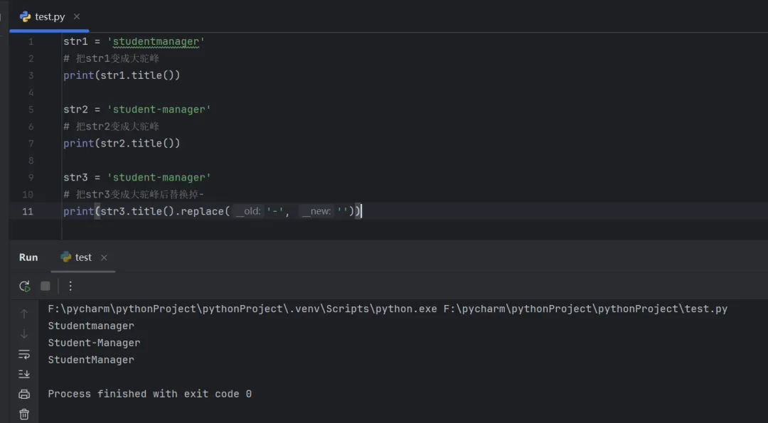 str1 = 'studentmanager'# 把str1变成大驼峰print(str1.title())str2 = 'student-manager'# 把str2变成大驼峰print(str2.title())str3 = 'student-manager'# 把str3变成大驼峰后替换掉-print(str3.title().replace('-', ''))