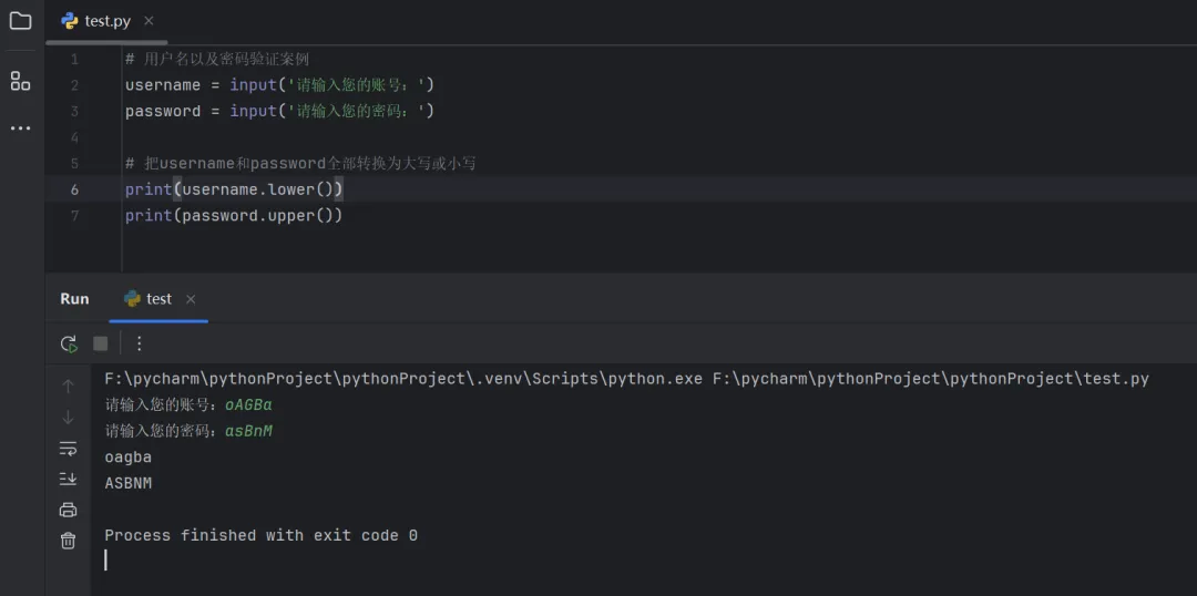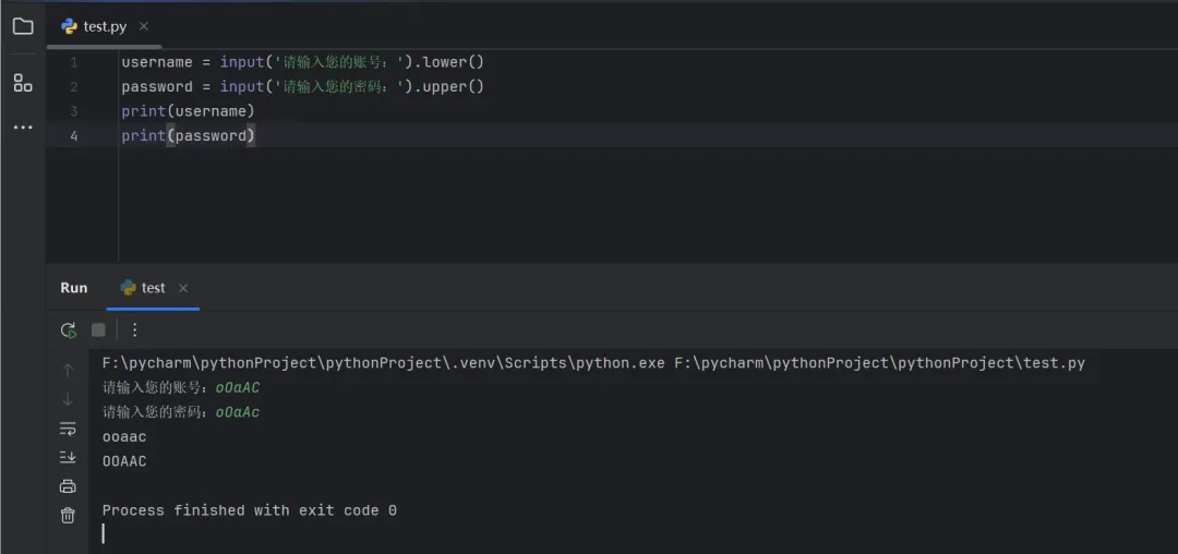 username = input('请输入您的账号:').lower()password = input('请输入您的密码:').upper()print(username)print(password)