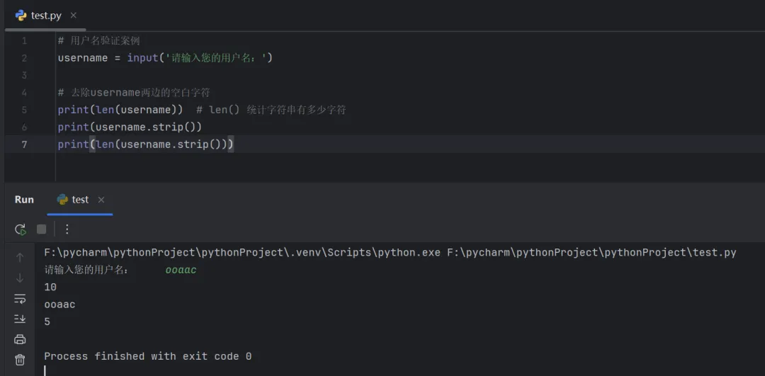 # 用户名验证案例username = input('请输入您的用户名:')# 去除username两边的空白字符print(len(username)) # len() 统计字符串有多少字符print(username.strip())print(len(username.strip()))