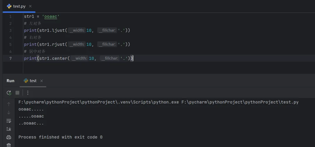 str1 = 'ooaac'# 左对齐print(str1.ljust(10, '.'))# 右对齐print(str1.rjust(10, '.'))# 居中对齐print(str1.center(10, '.'))
