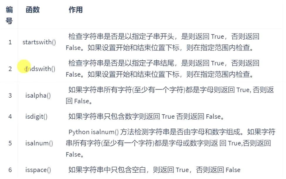 作用:检查字符串是否是以指定子串开头,是则返回True,否则返回False。如果设置开始和结束位置下标,则在指定范围内检查。