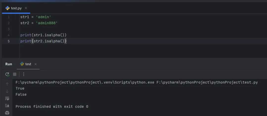 str1 = 'admin'str2 = 'admin888'print(str1.isalpha())print(str2.isalpha())