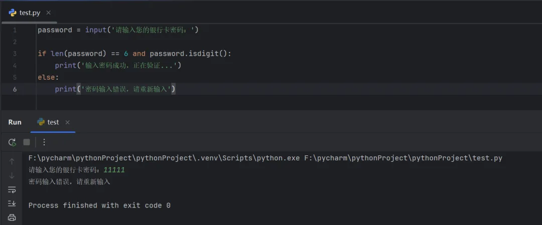 password = input('请输入您的银行卡密码:')if len(password) == 6and password.isdigit(): print('输入密码成功,正在验证...')else: print('密码输入错误,请重新输入')