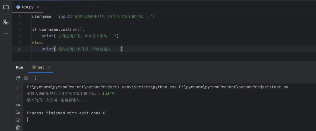 username = input('请输入您的用户名(只能包含数字和字母):')if username.isalnum(): print('合理的用户名,正在录入系统...')else: print('输入的用户名有误,请重新输入...')