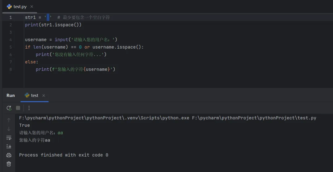 str1 = ' ' # 最少要包含一个空白字符print(str1.isspace())username = input('请输入您的用户名:')if len(username) == 0or username.isspace(): print('您没有输入任何字符...')else: print(f'您输入的字符{username}')