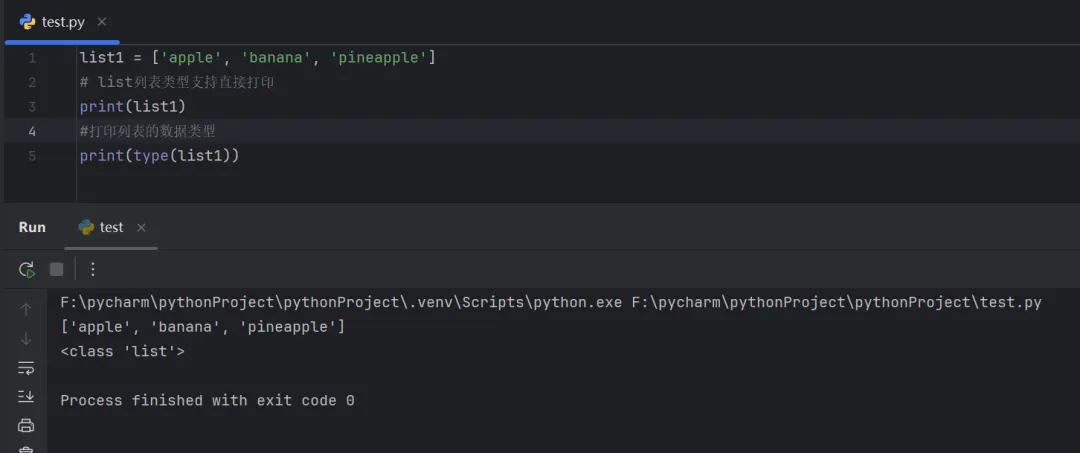 list1 = ['apple', 'banana', 'pineapple']# list列表类型支持直接打印print(list1)#打印列表的数据类型print(type(list1))